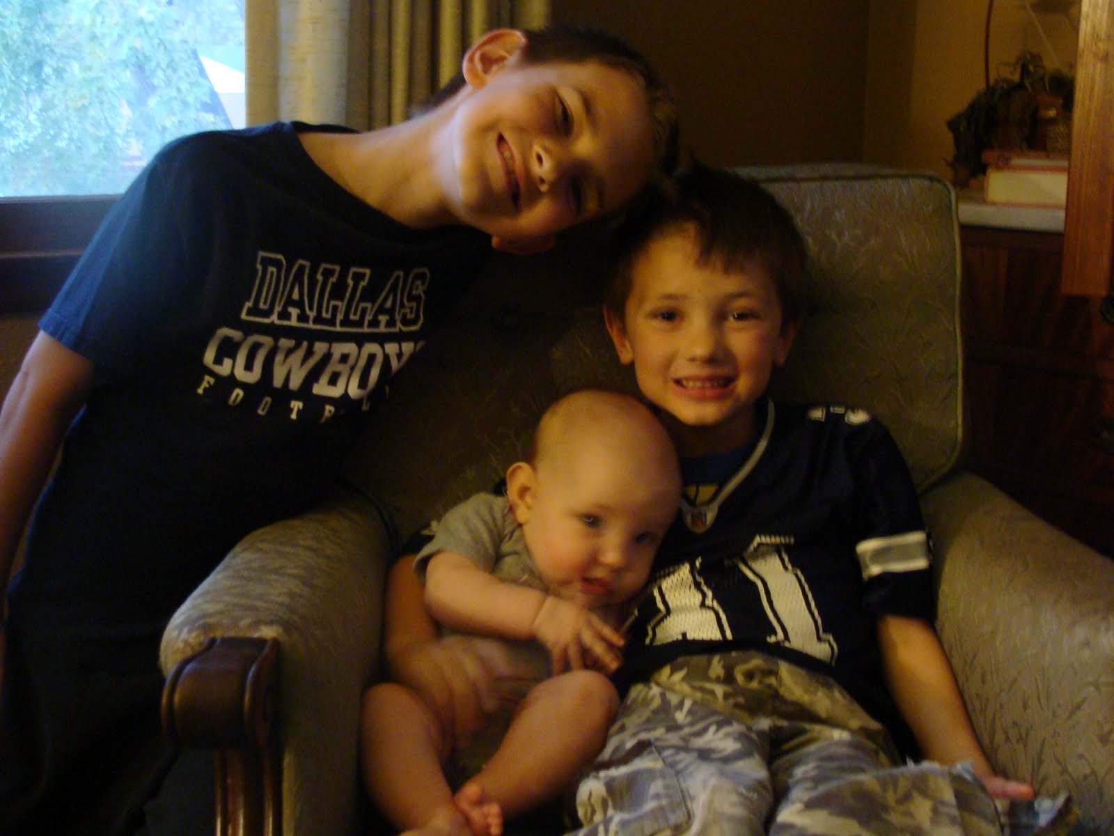 The guys adore their little sister. The other day, Hope was on blanket on the floor and they were laying on their tummy's by her. Every time she would look from one brother to the other, they would say, "See she's looking at me, she loves me more." Joey is quick to want to hold her. Jon is willing to, but is more apt to interact with her while she is in a seat or my arms. It is amazing how much they have matured in the last couple months, especially Jon. He will be nine next month and is starting to feel like a mini adult. When I ask him to help, he often does so immediately and cheerfully. Notice I said "often" not "always," he is still an eight year old boy. He'll often make little noises with his mouth or body parts that can drive me insane. But apparently that is very common in prepubescent boys. Crazy that I have a child who could be considered prepubescent.